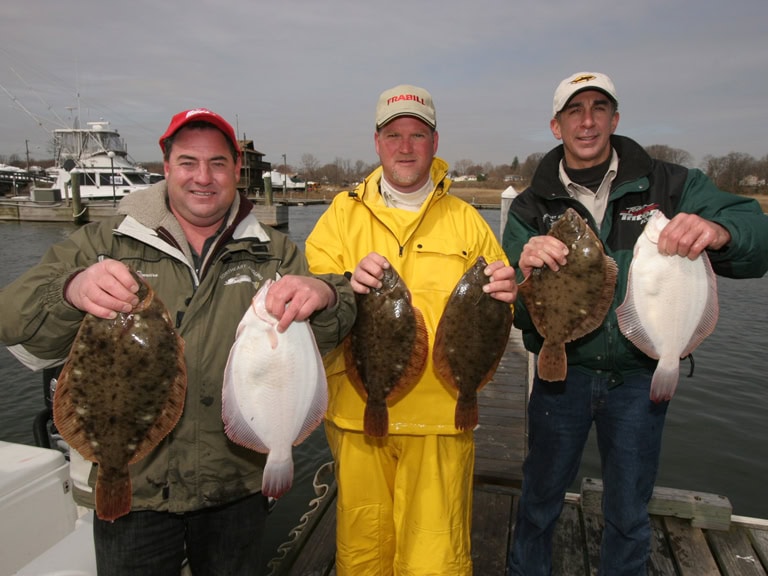 The action in the harbor is typically non-stop. Put a couple of anglers in the boat, each with a two hook rig baited with half a sandworm and they will go through a lot of bait. Most anglers buy an entire flat (144) of sandworms, a several chum logs and a couple of frozen containers of shucked clams. There are plenty of other pesky critters that keep the action going. If they get too numerous and the flounder are few and far between it is time to move to a new spot. The sandworms are cut in half and threaded over the length of the hook. The remaining portion of each half hangs off the hook and provides the action. The clams are cut into pendant shaped strips and threaded a couple of times on the hook, with the bulk of the strip waving in the current.
